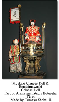 The third Tamaya Shobei's creations include a flag-waving doll belonging to the Nakamoto neighborhood of Komaki City, a doll which performs handstands on top of a plum tree belonging to Inuyama City's Tomachi neighborhood, and a flag-waving doll and dancing boy who transforms into a bird on Nishibiwajima's (present-day Kiyosu) Kōjin-sha float. These dolls are still used to this day in local festivals.